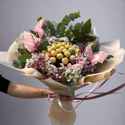 Ferrero Rocher saldainių ir gėlių puokštė: Puikus elegancijos ir saldumo derinys